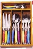 Le fameux Laguiole s'invite à votre table grâce à cette ménagère de 24 pièces. Mitre inoxLame microdentéeBloc de bois compactCouleurs : anis, prune, bleu, rouge, turquoise, soleilManche en ABS iriséCompatible lave-vaisselle6 fourchettes6 couteaux6 cuillères à soupe6 cuillères à café
