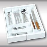 Tiroir à couvert en bois blanc et coulissant pour s'adapter à tout type de tiroirs. Tiroir à couverts en bambou, solide et ajustable. Dimensions : L.35 - 58 x P.43 x H.6 cm. Ref. 88290