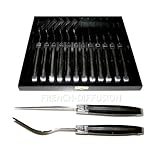 LAGUIOLE{R} authentique - 12 pcs MENAGERE STEAK - manche en BOIS NOIR EXOTIQUE (6 COUTEAUX STEAK + 6 FOURCHETTES) - lame lisse + 2.5 mm d'epaisseur ! - en coffret Laguiole en bois fermant (LAGUIOLE officiel - couverts de table pour 6 personnes - emballage & message cadeau disponible - expedie directement de FRANCE) - prix de vente special!